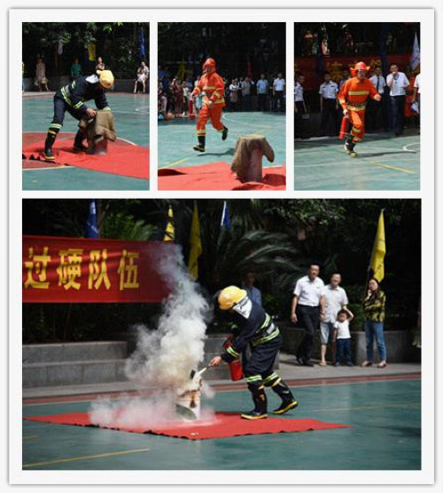 現(xiàn)場比賽共分為4個環(huán)節(jié),第一個環(huán)節(jié)為軍事列隊展示,要求場上的護衛(wèi)隊伍軍容整齊劃一,軍姿嚴謹標準,每個人的動作要求協(xié)調(diào)一致,動作規(guī)范熟悉、自然流暢。第二個環(huán)節(jié)為滅火器4X50米接力,不僅是速度與毅力的考驗,更是要檢驗隊員之間的配合是否默契。第三個環(huán)節(jié)為50米液體滅火,賽場上設(shè)置兩個火盆,并模擬著火現(xiàn)場,護衛(wèi)隊員們需第一時間趕赴火盆處,用滅火器等消防器材進行滅火作業(yè),該環(huán)節(jié)不僅模擬真實場景,更極具觀賞性和真實性。最后一個環(huán)節(jié)為消防出水操,隊員們在最短的時間內(nèi),快速沖鋒奔襲、配合拋擲水帶等動作,這要求隊員之間必須準確快速和協(xié)調(diào)合作。