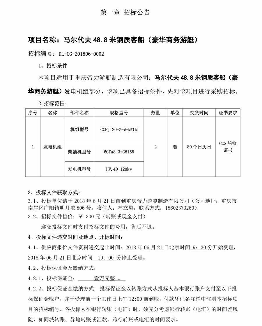 馬爾代夫48.8米鋼質(zhì)客船(豪華商務(wù)游艇)發(fā)電機(jī)組部分采購招標(biāo)