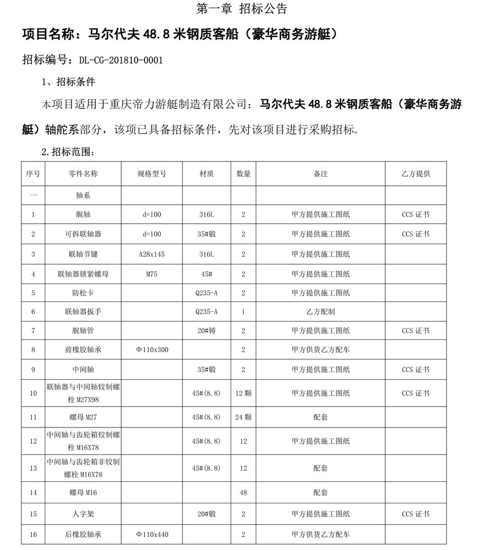 馬爾代夫48.8米鋼質(zhì)客船(豪華商務(wù)游艇)軸舵系部分招標