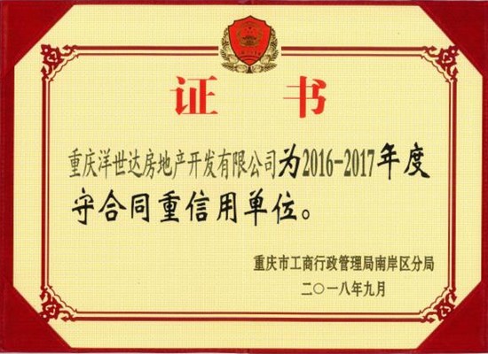 2018年12月4日下午2點30分,重慶市工商行政管理局南岸區(qū)分局在分局二樓會議室隆重召開了南岸區(qū)“守合同 重信用”企業(yè)座談會。分局黨組書記、局長齊琦、分管局長鄔繼貧、相關科室負責人及南岸區(qū)企業(yè)代表約150人出席了本次會議。重慶洋世達房地產開發(fā)有限公司榮獲南岸區(qū)2016-2017年度守合同重信用單位稱號。