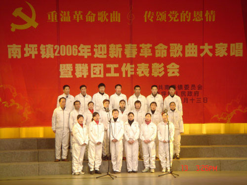 2006年1月13日下午,由重慶市南岸區(qū)南坪鎮(zhèn)主辦,在重慶市南岸區(qū)文化藝術(shù)中心廣場(chǎng)舉行了一場(chǎng)別開(kāi)聲面的“南坪鎮(zhèn)2006年迎新春革命歌曲大家唱暨群團(tuán)工作表彰會(huì)”。 洋世達(dá)集團(tuán)公司由黨委副書(shū)記劉洪利同志帶隊(duì),組織了21名黨員參加了本次活動(dòng),并演唱了《革命人永遠(yuǎn)是年青》等革命歌曲。