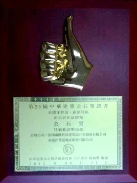 9月21日晚7點(diǎn),羅明德總工程師參加了由中華建筑金石獎(jiǎng)活動(dòng)委員會(huì)在臺(tái)灣舉辦的第23屆中華建筑金石獎(jiǎng)?lì)C獎(jiǎng)典禮。重慶“洋世達(dá)•南濱特區(qū)”項(xiàng)目,榮獲了“頂尖居住品牌類(lèi)金石獎(jiǎng)”。